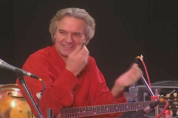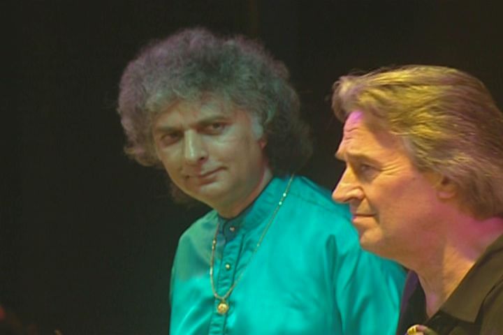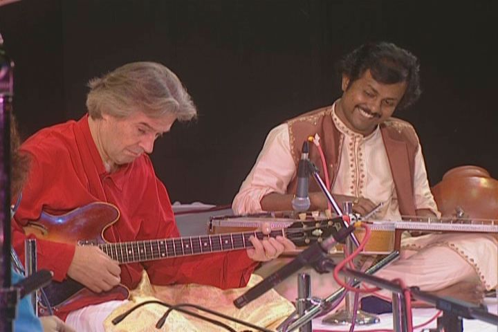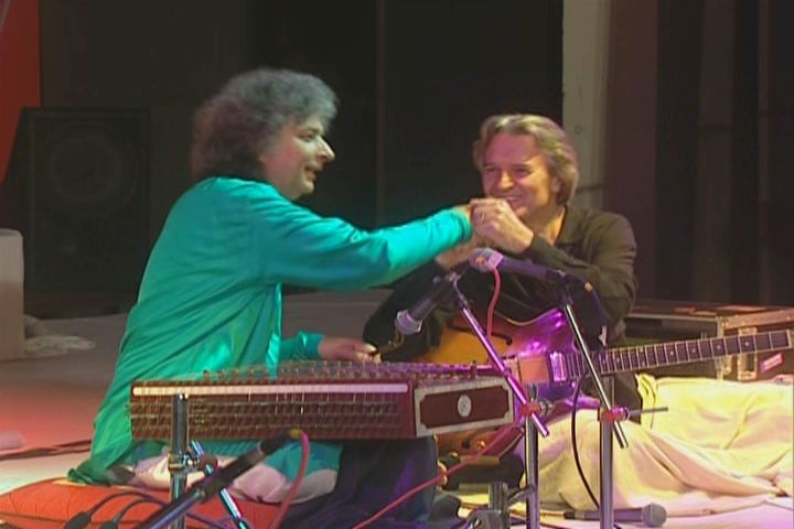 kisses the hand of Shiv Kumar Sharma and shows mutual appreciation for fellow guitarist Debashish Bhattacharya. Looks, glances,
