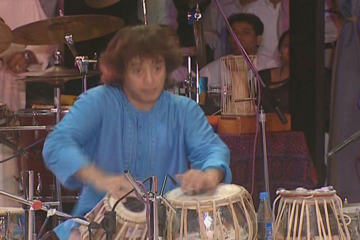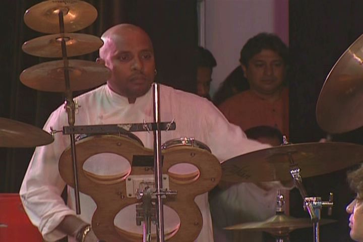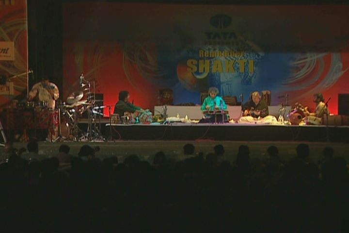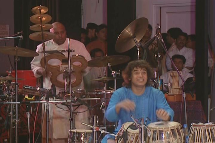 maestro Zakir Hussain seated with the others on a low platform repeatedly looks over his shoulder helping to pull the standing Sivamani into